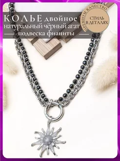 6513 Яркое двойное колье -цепь черный агат с кулоном солнце