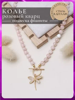6112 Колье природный розовый кварц с кулоном милая стрекозка