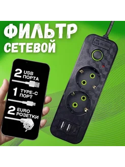 Удлинитель сетевой фильтр 2 розетки 2 USB 1 Type-C