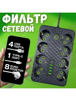Удлинитель сетевой фильтр 8 розеток 4 USB 1 Type-C