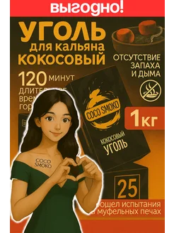 Уголь для кальяна 25 мм Без запаха, Кокосовый, 1 кг
