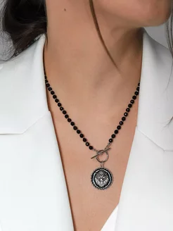 6340 Шикарное колье с серебристой подвеской черный лев люкс