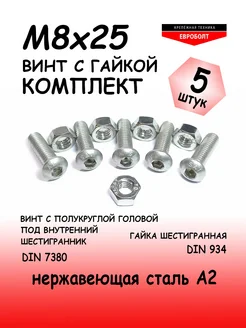 Винт под шестигранник М8х25 7380 с гайкой М8 нерж. по 5шт