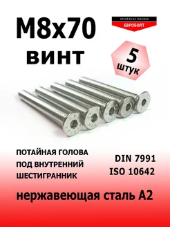 Винт потайной под шестигранник М8х70 DIN7991 нерж, 5 шт