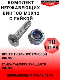Винт нерж М3х12 потайной DIN965 с стопорной гайкой М3, 10 шт