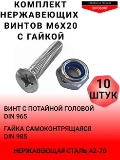 Винт нерж М6х20 потайной DIN965 с стопорной гайкой М6, 10 шт