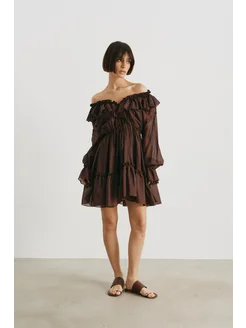 летнее платье бохо с открытыми плечами воланами шоколад