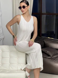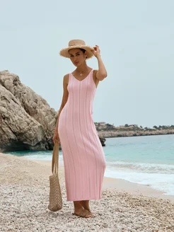 Длинное летнее платье вязаное в полоску на широких бретелях