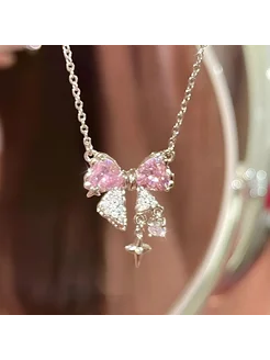 Розовое бижутерное ожерелье бантик с крестом из циркона