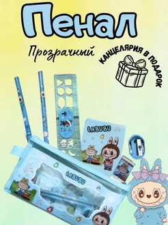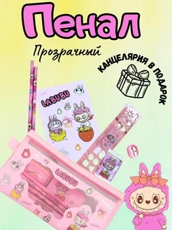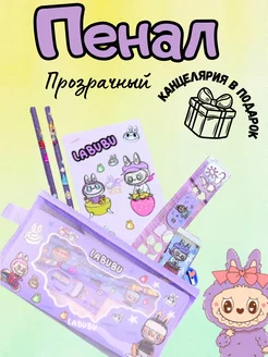 Пенал прозрачный сетка с канцелярией лабубу