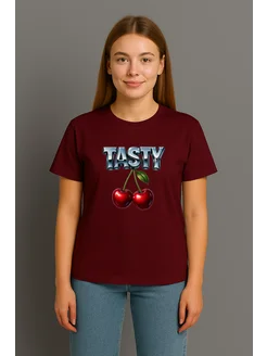 Бордовая хлопковая футболка с надписью и вишнями