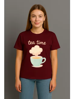 Бордовая хлопковая футболка с принтом 'Tea Time'