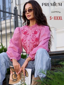 Рубашка в клетку виши с вышивкой, длинный рукав фонарь