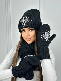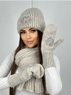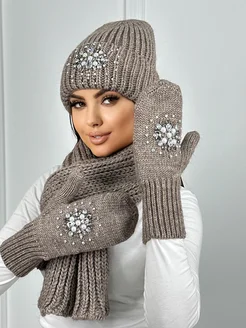 Комплект Шапка теплая вязаная с шарфом и варежками