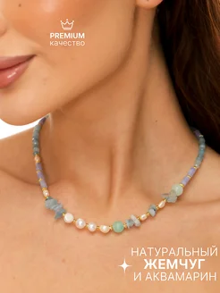Ожерелье из натуральных камней жемчуга и аквамарина