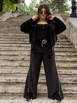 Велюровый спортивный костюм с воротником и брюками палаццо