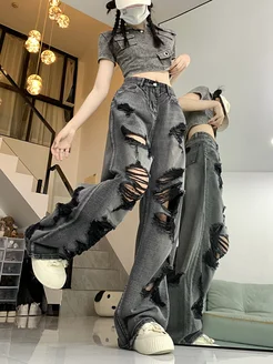 Джинсы рваные высокая посадка широкие трубы Y2K