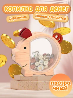 Деревянная детская копилка свинка с прозрачной для детей