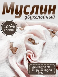 Муслин ткань для шитья 3 метра двухслойный мишки розовый