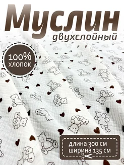 Муслин ткань для шитья 3 метра двухслойный мишки белый