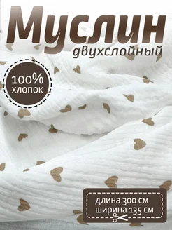 Муслин ткань для шитья 3 метра двухслойный сердечки коричн