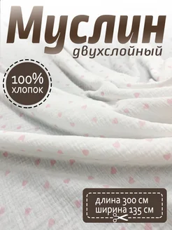 Муслин ткань для шитья 3 метра двухслойный сердечки розовые
