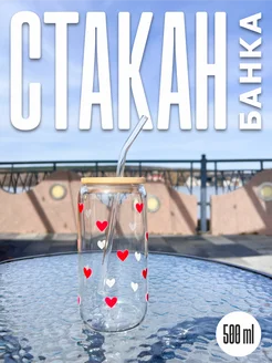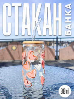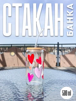 Стакан-банка с крышкой и трубочкой 500 мл УФ-дтф "Сердечки"