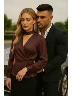 Блузка шелковая праздничная на запах с баской и шарфом