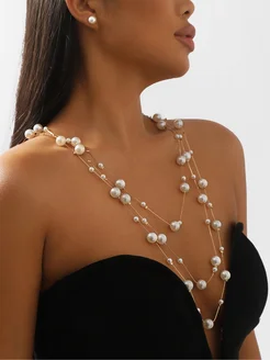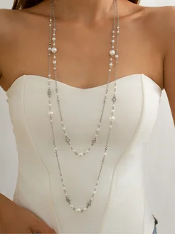 Цепочка на шею длинная с жемчугом сотуар бодичейн