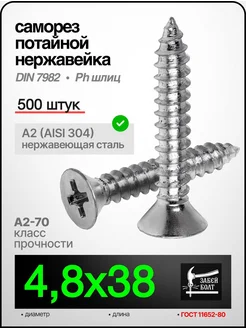Саморез, шуруп 4.8x38 мм, нержавеющий, DIN 7982, 500 шт