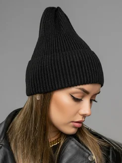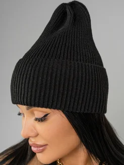 Шапка женская осенняя вязаная бини с отворотом чёрная