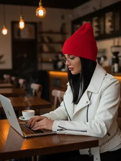 Шапка осенняя вязаная бини с отворотом красная