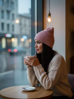 Шапка осенняя вязаная бини с отворотом пудра