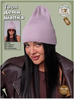 Шапка осенняя вязаная бини с отворотом лавандовая
