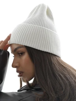 Шапка осенняя вязаная бини с отворотом белая