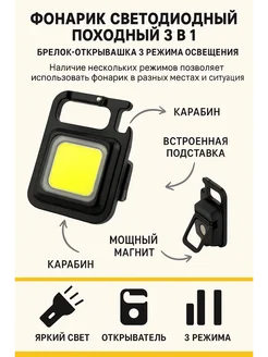 Фонарик светодиодный походный 3 в 1 брелок-открывашка