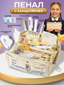 Пенал бежевый подростковый с канцелярией