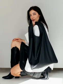 Черная кожаная большая сумка шоппер мешок
