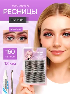 Накладные ресницы пучки с клеем и пинцетом, изгиб C 13 мм