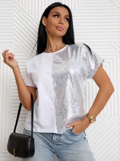 Футболка женская белая нарядная с пайетками больших размеров