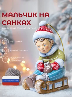 Елочная игрушка новогодняя фарфоровая "Мальчик на санках"