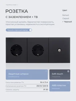 Розетка тройная черная матовая для TV