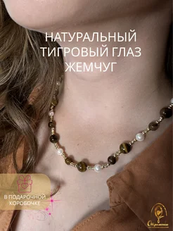 Колье из натуральных камней тигрового глаза и жемчуга чокер