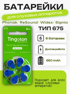 Батарейки для слуховых аппаратов тип 675, 6 шт