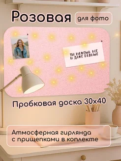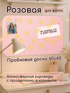 Розовая пробковая доска с гирляндой на прищепках 40х30