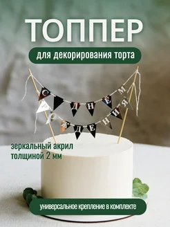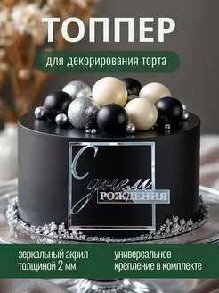 Топпер для торта "С Днем Рождения" квадратный акрил серебро