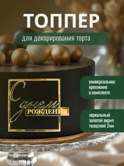 Топпер для торта "С Днем Рождения" квадратный акрил золото