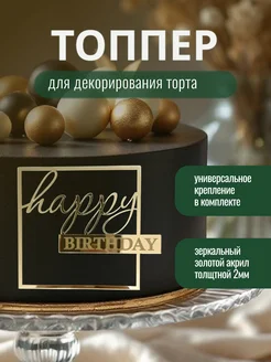 Топпер для торта "Happy Birstday" квадратный акрил золото