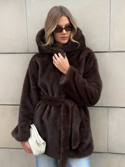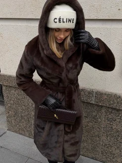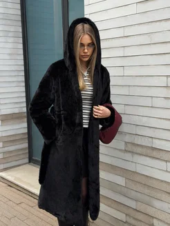 Шуба искусственная зимняя длинная экошуба с капюшоном эко