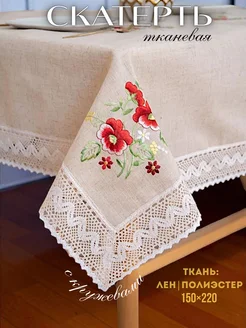 Скатерть 150×220 из льна с вышивками и кружевами